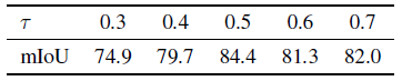 표 6과 같이 너무 작은 τ 값은 불안정한 SAM 예측으로 이어져 3D 마스크에 노이즈를 도입합니다.