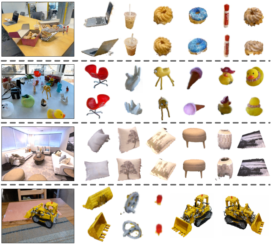 그림의 마지막 행은 Lego bulldozer의 버킷, 작은 바퀴 및 돔 라이트에 대한 SA3D의 정확한 세그멘테이션을 보여줍니다.
