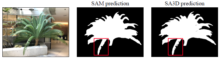 그림 6에서 저희는 SA3D가 SAM의 세그멘테이션 오류를 제거하고 구멍 및 가장자리와 같은 세부 정보를 효과적으로 캡처할 수 있음을 보여줍니다.