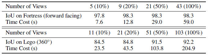 반대로 카메라 포즈의 범위가 더 넓은 장면에서는 더 많은 수의 뷰가 필요하여 더 큰 개선을 얻을 수 있습니다.