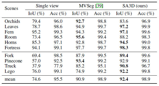 표 2에서 볼 수 있듯이 SA3D는 대부분의 장면에서 MVSeg [39]보다 성능이 뛰어나며, 특히 Truck의 +5.6mIoU와 Lego의 +17.3mIoU를 능가합니다.