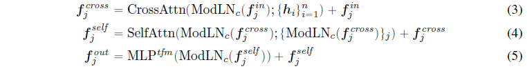 하위 레이어 (즉, CrossAttn, SelfAttn, MLP^tfm)의 ModLN 연산자는 레이어 정규화 및 변조 MLP^mod에서 학습 가능한 매개 변수 세트를 사용합니다.