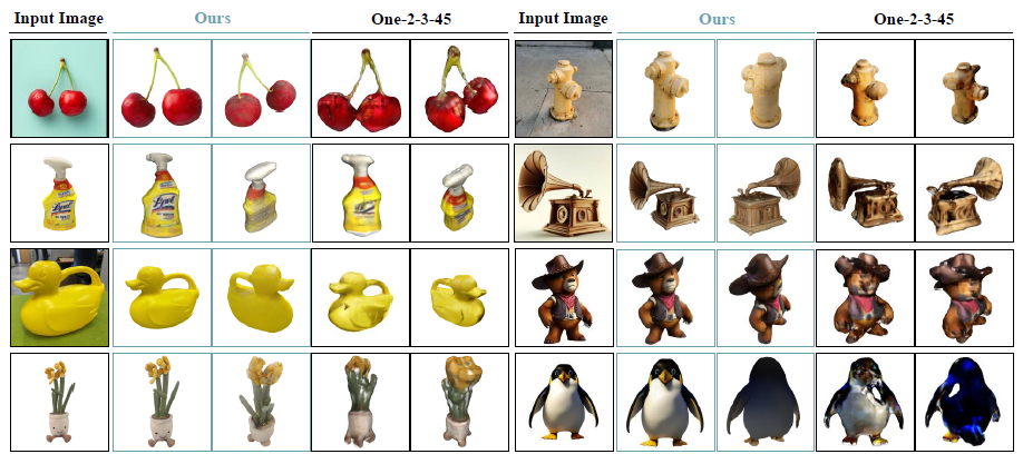 그림 3에서는 LRM과 2D 디퓨전 모델로 멀티뷰 이미지를 생성하여 3D 재구성에 SOTA 단일 이미지를 달성하는 동시 작업인 One-2-3-45를 비교합니다(Liu et al., 2023a).