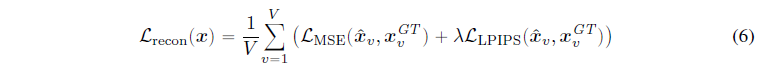을 최소화하며, 여기서 L_MSE는 정규화된 픽셀 단위의 L2 loss, L_LPIPS는 the perceptual image patch similarity (Zhang et al., 2018), λ는 맞춤형 가중치 계수입니다.
