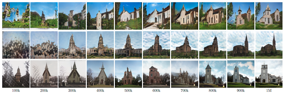 그림 5는 LSUN-Church에서 학습하는 동안 고정 노이즈 벡터 z에 대한 샘플을 보여줍니다.