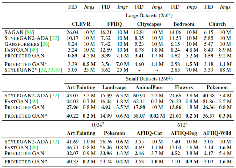 대규모 데이터 세트의 경우 10M 이상의 이미지에 대해 학습된 StyleGAN2의 수를 보고하여 이전 문헌에서 달성한 가장 낮은 FID 값을 보고합니다(StyleGAN2*로 표시됨).