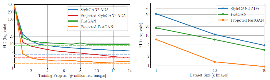 특히 FastGAN의 경우 수렴 속도와 최종 FID 모두의 개선이 중요하지만 StyleGAN2의 개선은 덜 두드러집니다.