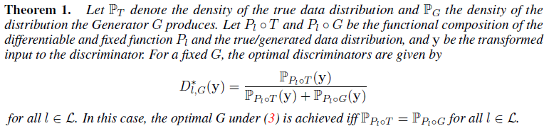 이 theorem에서 관련 판별기 D_l을 사용하는 피쳐 프로젝터 P_l이 생성기가 P_l을 통해 한계를 따라 실제 분포와 일치하도록 장려한다는 결론을 내렸습니다.