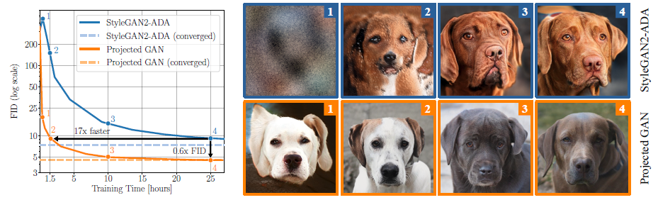 중요한 것은 Projected GAN이 이전에 가장 낮은 FID를 최대 40배 더 빠르게 일치시켜 동일한 계산 리소스가 주어지면 월 클럭 시간을 5일에서 3시간 미만으로 단축한다는 것입니다.