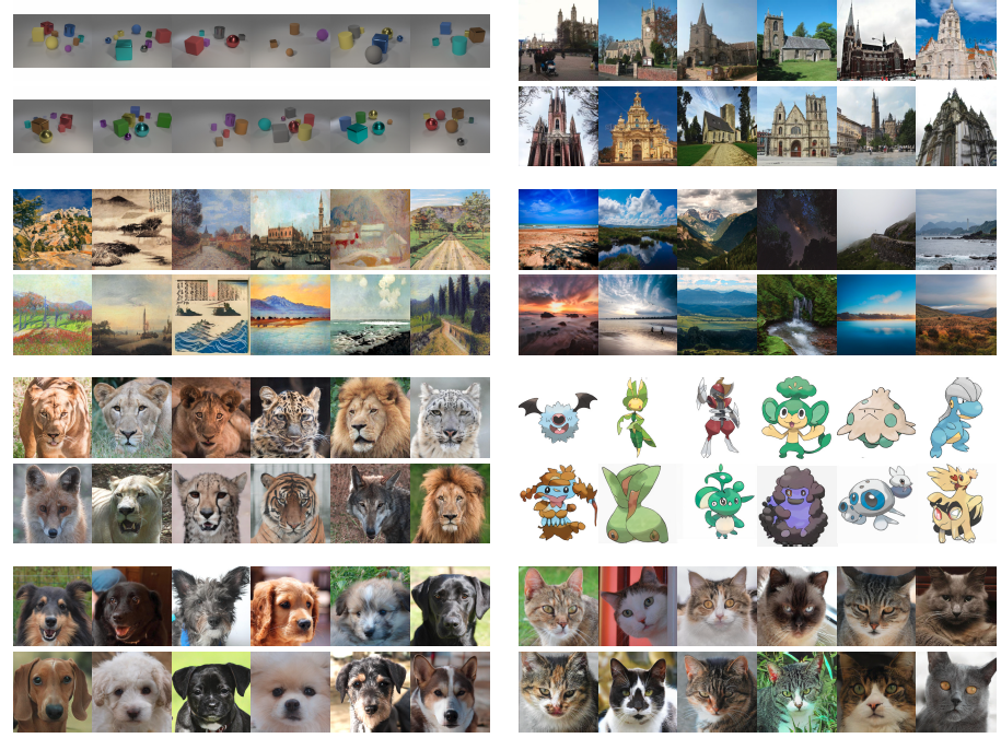 크기(수억 ~ 수백만 샘플), 해상도(256^2 ~ 1024^2), 시각적 복잡성(클립 아트, 그림 및 사진) 측면에서 다양한 데이터 세트를 다룹니다.