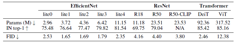 또한, 다양한 사전 학습된 네트워크에 대한 저희의 연구는 효율적인 모델이 Projected GAN 학습에 특히 적합하다는 것을 보여줍니다.
