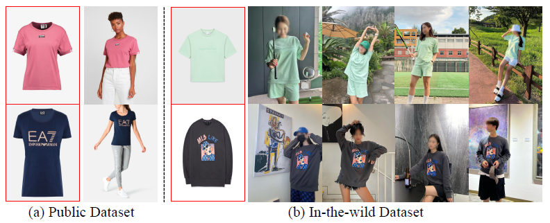 또한 의류는 다양한 패턴과 로고를 가지고 있어 VITON-HD 및 DressCode보다 virtual try-on이 더 어렵습니다(예: 그림 3 참조).