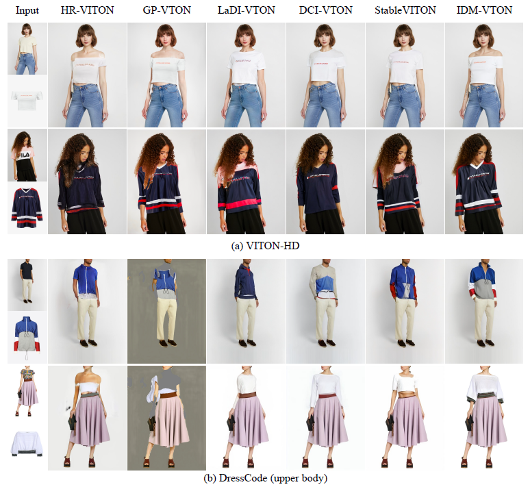 저희는 저희의 방법을 GAN 기반 방법 (HR-VITON [26] 및 GP-VTON [51]) 및 디퓨전 기반 방법 (LaDI-VTON [29], DCIVON [8] 및 StableVITON [22])과 비교합니다.