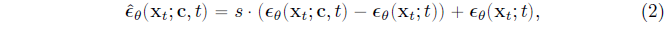 학습 단계에서 텍스트 조건화는 랜덤으로 드롭아웃(즉, 입력에 null-text를 부여)되고 추론 단계에서 CFG는 텍스트 조건화의 강도를 제어하기 위해 조건적 및 무조건적 노이즈 출력을 보간합니다: