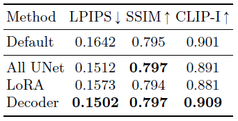 저희는 디코더 레이어를 파인튜닝하면 사용자 지정 방법 중 가장 성능이 우수한 반면 모든 UNet 레이어를 파인튜닝하면 비슷한 성능을 보여줍니다.