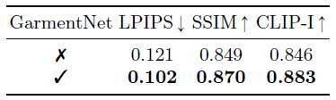비교를 위해 GarmentNet을 사용하지 않고 다른 모델을 학습합니다 (즉, IP-Adapter만 사용하여 의복 이미지를 인코딩).