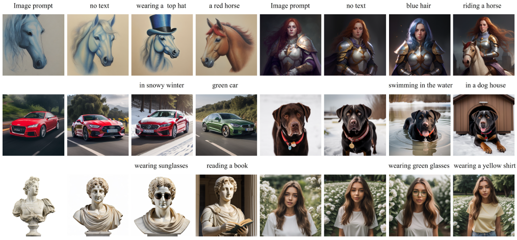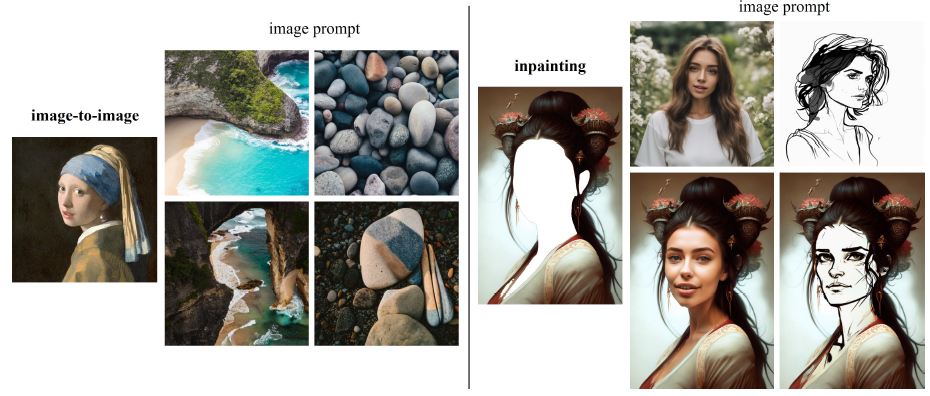 제안된 IP-Adapter는 이미지 프롬프트로 생성을 이루도록 설계되었지만 강력한 일반화 기능을 통해 더 넓은 범위의 애플리케이션을 사용할 수 있습니다.