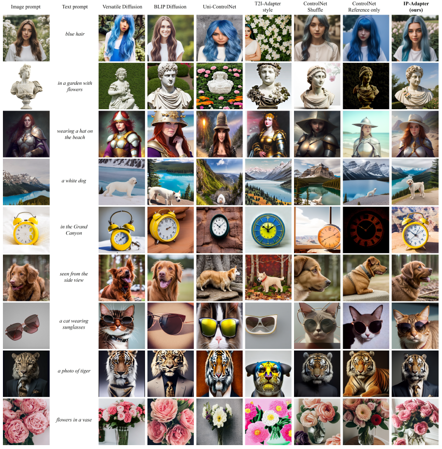 또한 IP-Adapter를 Versatile Diffusion, BLIP Diffusion [31], Uni-ControlNet, T2I-Adapter, ControlNet Shuffle 및 ControlNet Reference-only를 포함한 다른 방법과 비교합니다.