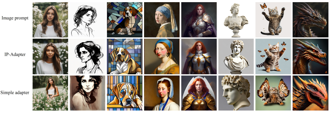 이러한 어댑터는 이미지 프롬프트를 사용하는 기능을 갖춘 것으로 볼 수 있지만 생성된 이미지는 프롬프트 이미지에 부분적으로만 충실합니다.
