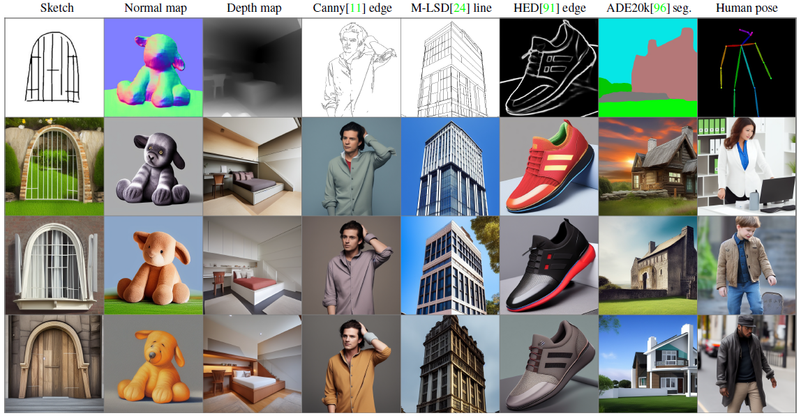 저희는 Stabel Diffusion 기능이 있는 ControlNets를 구현하여 Canny Edge [11], Depth Map [69], Normal Map [87], M-LSD lines [24], HED soft edge [91], ADE20K segmentation [96], Openpose [12] 및 사용자 스케치를 포함한 다양한 조건을 테스트합니다.