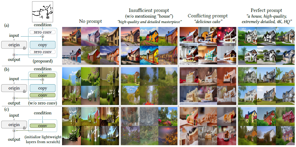경량 ControlNet-Lite(그림 8c)는 컨디셔닝 이미지를 해석할 만큼 강하지 않고 불충분하고 프롬프트가 없는 조건에서 실패합니다.