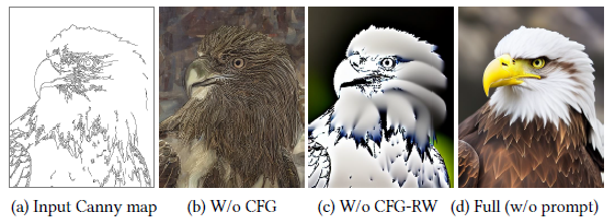 예를 들어, 어려운 경우 프롬프트가 표시되지 않을 때 ϵ_uc와 ϵ_c 모두에 추가하면 CFG 가이던스가 완전히 제거됩니다(그림 5b).