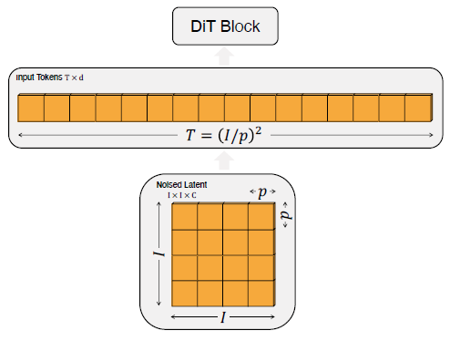 DiT의 첫 번째 레이어는 "patchify"로, 각 패치를 입력에 선형적으로 삽입하여 공간 입력을 차원 d마다 T개의 토큰 시퀀스로 변환합니다.