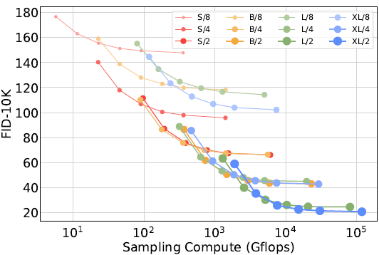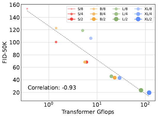 우리는 모델 Gflops와 FID-50K 사이에 강한 음의 상관관계가 있음을 발견했으며, 이는 추가적인 모델 계산이 개선된 DiT 모델의 중요한 요소임을 시사합니다.