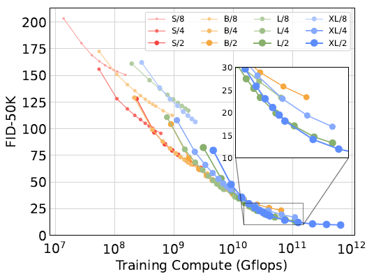그림 9에서 우리는 모든 DiT 모델에 대한 총 학습 계산의 함수로 FID를 표시합니다.