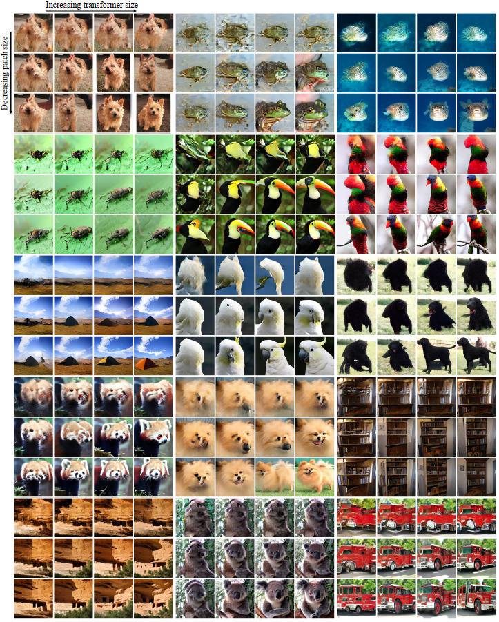 모든 경우에 모델 크기를 늘리고 패치 크기를 줄이면 디퓨전 모델이 상당히 개선된다는 것을 발견했습니다.