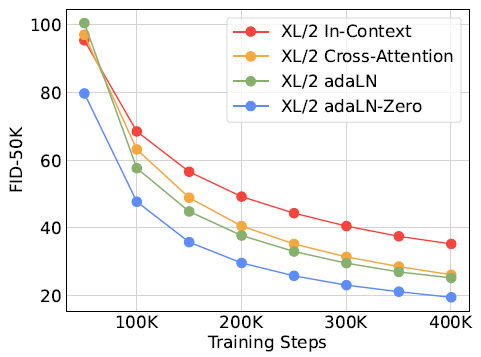 우리는 각각 다른 블록 설계를 사용하여 가장 높은 Gflop DiT-XL/2 모델 네 가지를 학습시킵니다—in-context (119.4 Gflops), cross-attention (137.6 Gflops), adaptive layer norm (adaLN, 118.6 Gflops) 또는 adaLN-zero (118.6 Gflops).