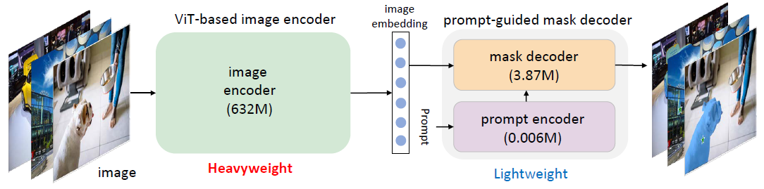원본 SAM의 프롬프트-가이드 마스크 디코더는 4M개 미만의 파라미터를 가지고 있으므로 가벼운 것으로 간주됩니다.