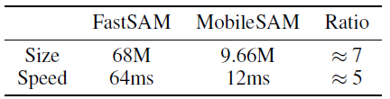 또한 MobileSAM은 동시 FastSAM보다 4배 빠르고 7배 작기 때문에 모바일 애플리케이션에 더 적합하다.