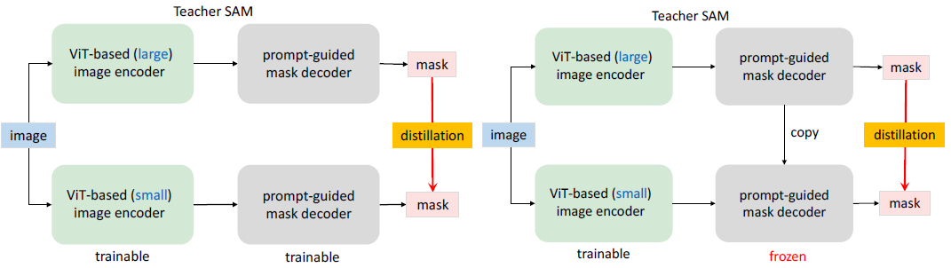이미지 인코더와 마스크 디코더의 결합된 최적화가 그 이유이며, 따라서 우리는 원본 SAM의 이미지 인코더 ViT-H에서 경량 이미지 인코더로 knowledge를 distilled하는 decoupled distillation을 제안한다.