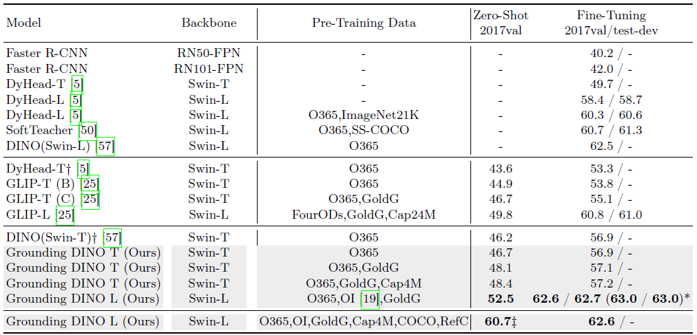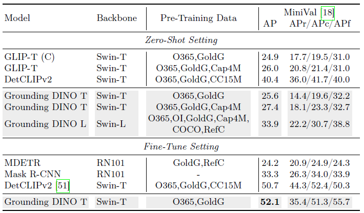 인상적으로, Swin-T 백본을 사용한 Grounding DINO는 풀 샷 설정에서 Swin-L을 사용한 DINO를 능가합니다.