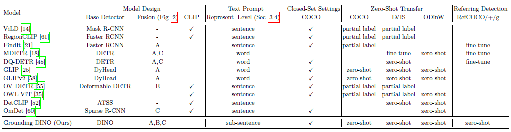 놀랍게도 O365 및 GoldG 데이터 세트에서만 사전 학습되었음에도 불구하고 Grounding DINO는 DetCLipv2-T를 1.5AP의 차이로 능가합니다.