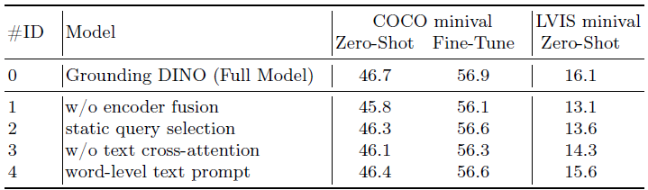 언어-가이드 쿼리 선택, 텍스트 크로스-어텐션 및 하위 문장 텍스트 프롬프트와 같은 다른 기술도 LVIS 성능에 긍정적으로 기여하여 각각 +3.0 AP, +1.8 AP, +0.5 AP의 상당한 이득을 얻었습니다.