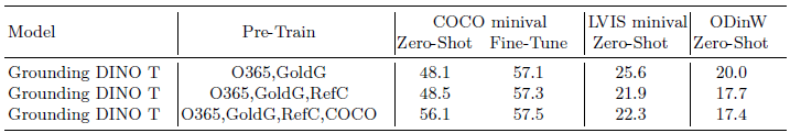 Grounding 데이터는 제로 샷 전송 설정에서 1AP (48.1 vs. 46.7) 이상을 도입하여 Grounding DINO에 여전히 도움이 됩니다.