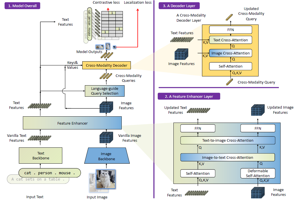 Grounding DINO는 듀얼-인코더-싱글-디코더 아키텍처입니다.