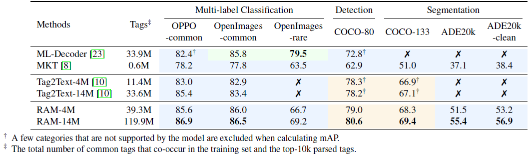 따라서 RAM은 고정된 카테고리와 수량 대신 자동으로 인식하고자 하는 모든 카테고리와 수량에 대한 레이블 쿼리를 사용자 지정할 수 있어 다양한 시각적 작업과 데이터 세트에 걸쳐 그 유용성을 향상시킵니다.