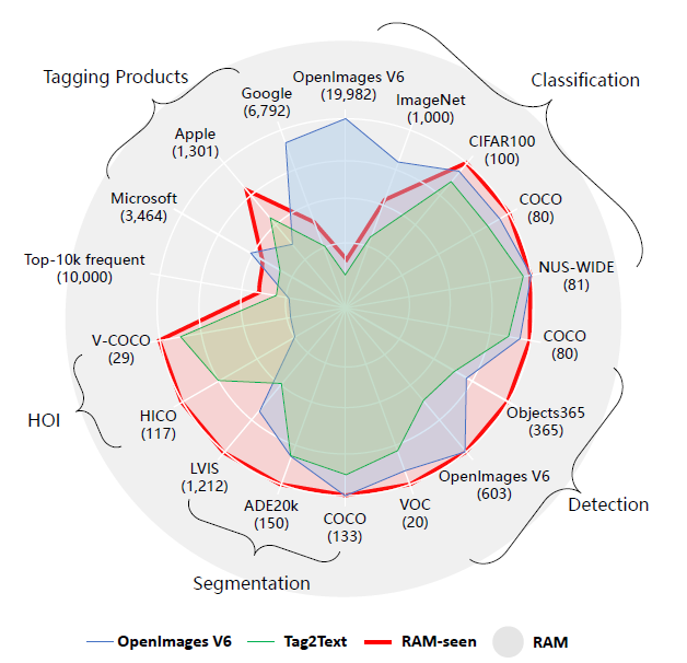 RAM은 컴퓨터 비전 분야의 대규모 모델에 상당한 진전을 이루었으며, 일반적인 카테고리를 높은 정확도로 인식하는 제로 샷 기능을 보여줍니다.