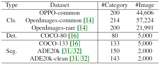 그러나 OpenImages 데이터 세트 내에서 레이블이 누락되고 주석이 올바르지 않은 문제로 인해 두 개의 고품질 하위 집합을 큐레이팅했습니다: 주석이 잘 달린 214개의 공통 카테고리로 구성된 OpenImagescommon과 오픈셋 실험을 위한 라벨 시스템에 포함되지 않은 200개의 카테고리로 구성된 OpenImages-rare.