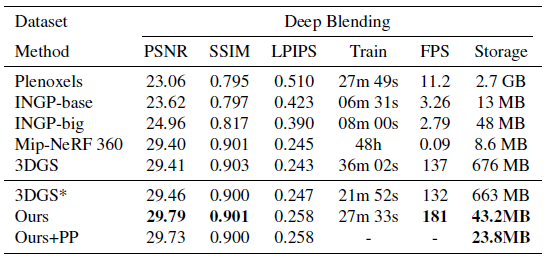 특히 실제 데이터셋인 Deep Blending [16]에서의 평가에서는 저장 효율성이 28배 이상 향상되고 렌더링 속도가 거의 40% 증가하여 새로운 SOTA 벤치마크를 설정하는 등 3DGS를 능가하는 성능을 보였습니다.
