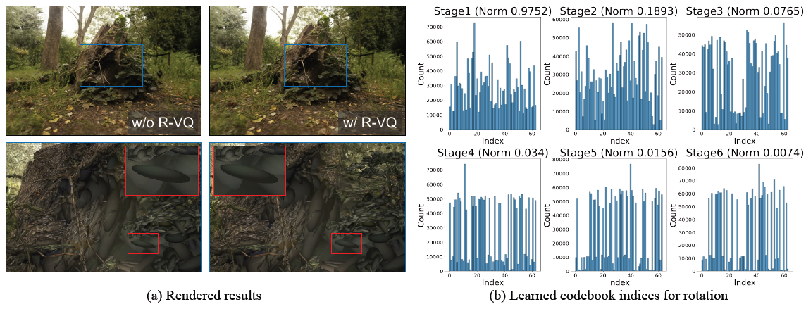 대부분의 가우시안은 R-VQ의 적용 여부에 관계없이 시각화에서 동일한 지오메트리를 유지하며, 소수의 가우시안만이 거의 눈에 띄지 않는 매우 미묘한 지오메트리 왜곡을 보이는 것으로 관찰되었습니다.