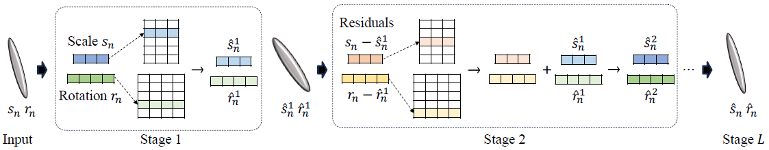 이러한 동기를 바탕으로, 우리는 vector quantization (VQ) [14]를 사용하여 스케일과 회전을 포함한 대표적인 지오메트릭 속성을 표현하도록 학습된 코드북을 제안합니다.