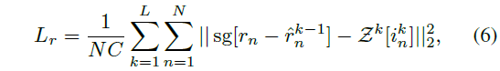 우리는 최종 단계 ˆr^L의 출력을 사용합니다 (앞으로는 간결성을 위해 위첨자 L을 생략하겠습니다), R-VQ 과정은 마스킹하기 전에 스케일 s에도 유사하게 적용됩니다 (스케일 L_s에 대해서도 objective 함수를 유사하게 사용합니다).