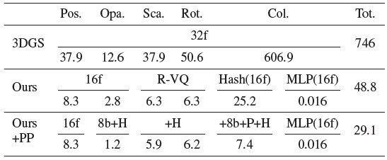 또한, 각 가우시안은 공분산 행렬이나 높은 차수의 SH와 같은 여러 렌더링 관련 속성으로 구성되어 있기 때문에 3DGS는 현실적인 장면을 위해 1GB를 초과하는 등 상당한 메모리 및 저장 자원을 필요로 합니다.