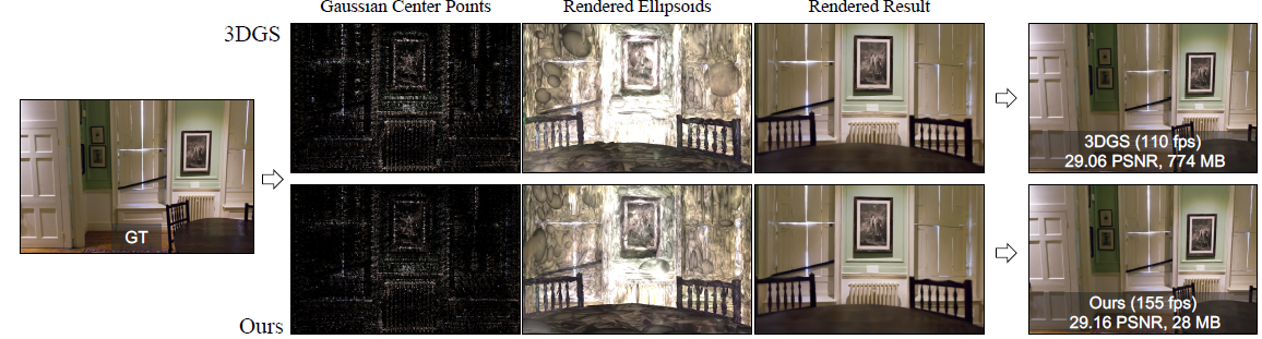 그러나 3DGS는 렌더링된 이미지의 높은 충실도를 유지하기 위해 상당한 수의 3D 가우시안을 필요로 하기 때문에 상당한 단점이 발생합니다.