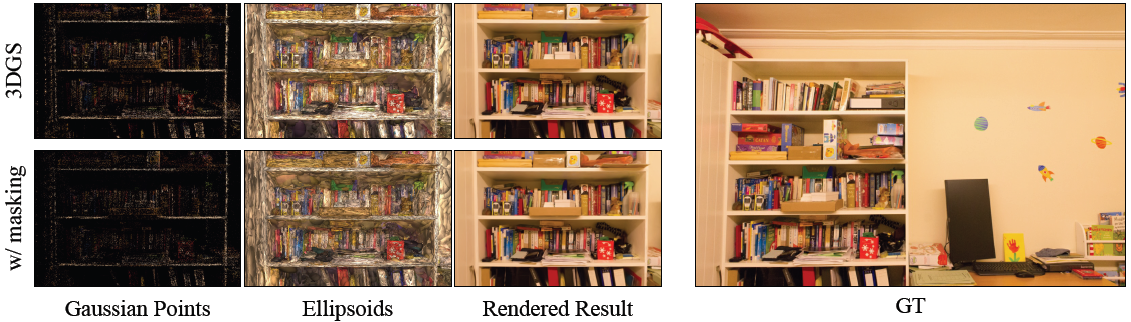 또한, 학습 도중 밀집화를 멈추고 가우시안의 수를 끝까지 유지하는 기존의 3DGS와 달리, 전체 학습 과정을 일관되게 마스킹하여 불필요한 가우시안을 효과적으로 줄이고 학습 단계 전반에 걸쳐 낮은 GPU 메모리로 효율적인 계산을 보장합니다(그림 3).