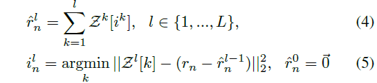 벡터 양자화를 나이브하게 적용하려면 계산 복잡성과 대용량 GPU 메모리가 필요하므로, 우리는 코드북 크기 C로 VQ의 L 단계를 계단식으로 변환하는 residual vector quantization (R-VQ) [48]을 채택합니다 (그림 4)